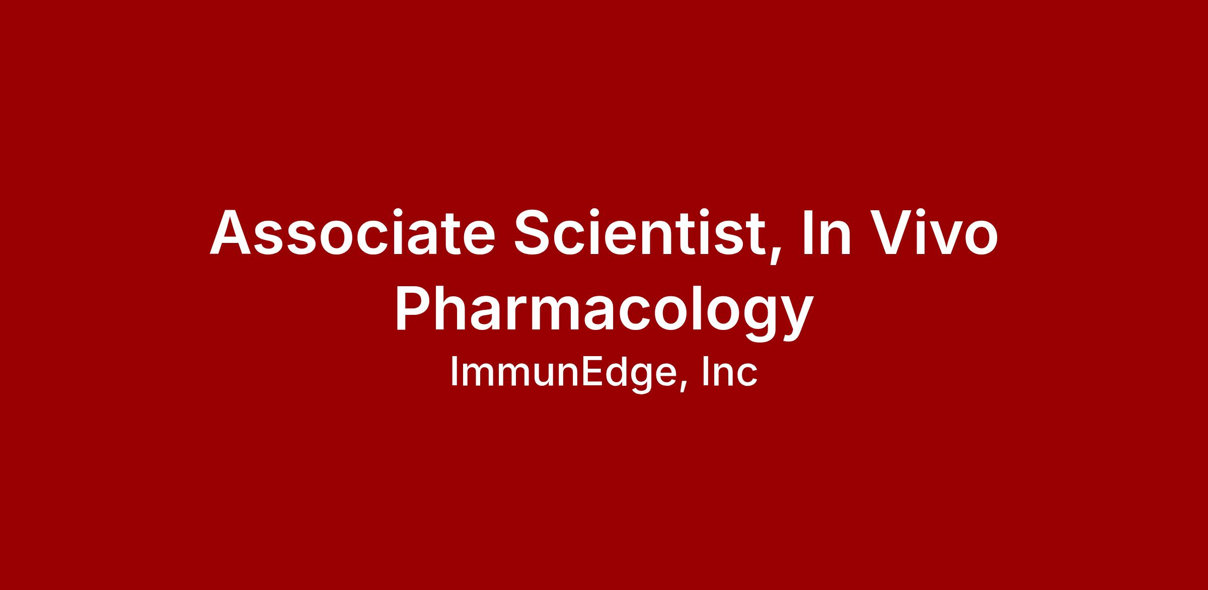 ImmunEdge has an exciting opportunity for an Associate Scientist with strong hands-on in vivo experience, flow cytometry, and cell culture expertise to join our In Vivo Pharmacology team. This individual will play a key role in advancing preclinical oncology and immunology programs by designing, executing, and analyzing in vivo studies to support candidate selection, mechanistic studies, and translational strategy. Strong candidates will be highly collaborative, scientifically rigorous, and passionate about drug discovery and immune-mediated diseases. Experience working in a dynamic, early-stage biotech environment and contributing across discovery and translational workflows is highly valued.